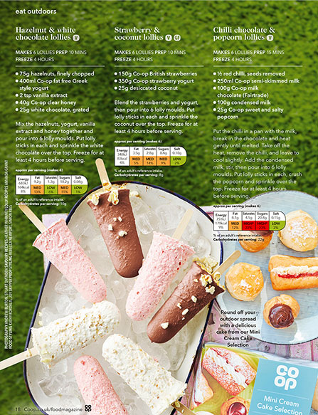 This project involved me retouching and colour-correcting images of ice lollies for Coop Food Magazine's 'eat outdoors' spread. I masked and photo-montaged the lollies onto the background image, and successfully retouched vanilla ice lollies to appear chocolate in colour, with added pieces of popcorn. I also dodged and burned the background image to ensure text copy remained legible for print.