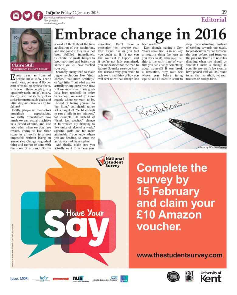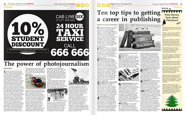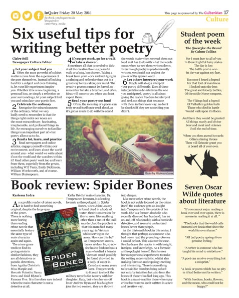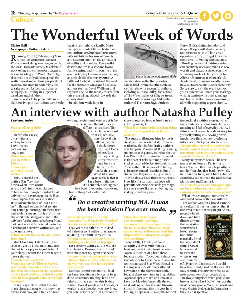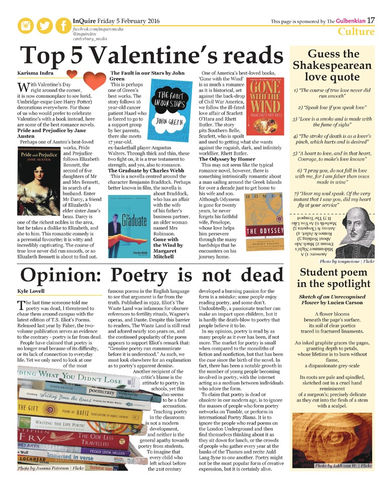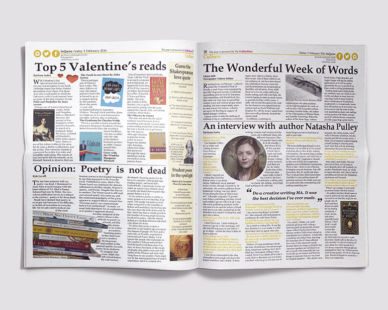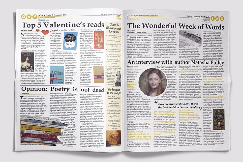 During my time working as Newspaper and Website Culture Editor for InQuire, I was responsible for managing, organising and producing content for the newspaper's culture section. I presented ideas at weekly meetings, delegated articles to a team of writers, wrote articles, editing articles and laid the section each fortnight using InDesign. Culture topics include: literature, poetry, theater, and art. Editorial features include authors interviews, book reviews, cultural events in the local area, and theater reviews.