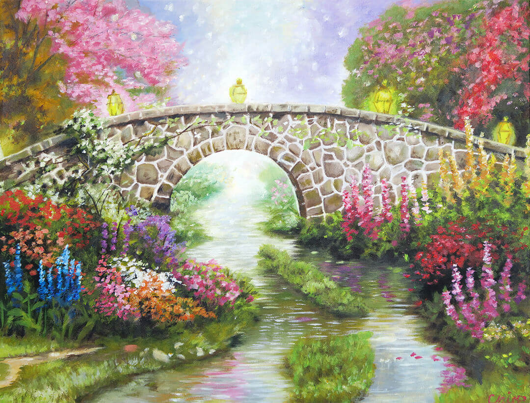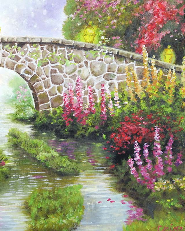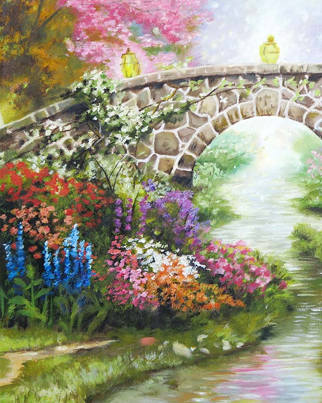 This is a landscape painting I created using acrylic paints on a 18"x15" canvas. I used many different colours to bring the image to life and focussed on reflections, light, shadow and texture. To create the flowers, I dabbed the paint brush onto the canvas, which also gave some 3D texture to the painting. The river flows through the bridge and fades into light in the distance, which I feel creates a strong central focus to the image, and could be interpreted with symbolic, heavenly connotations.