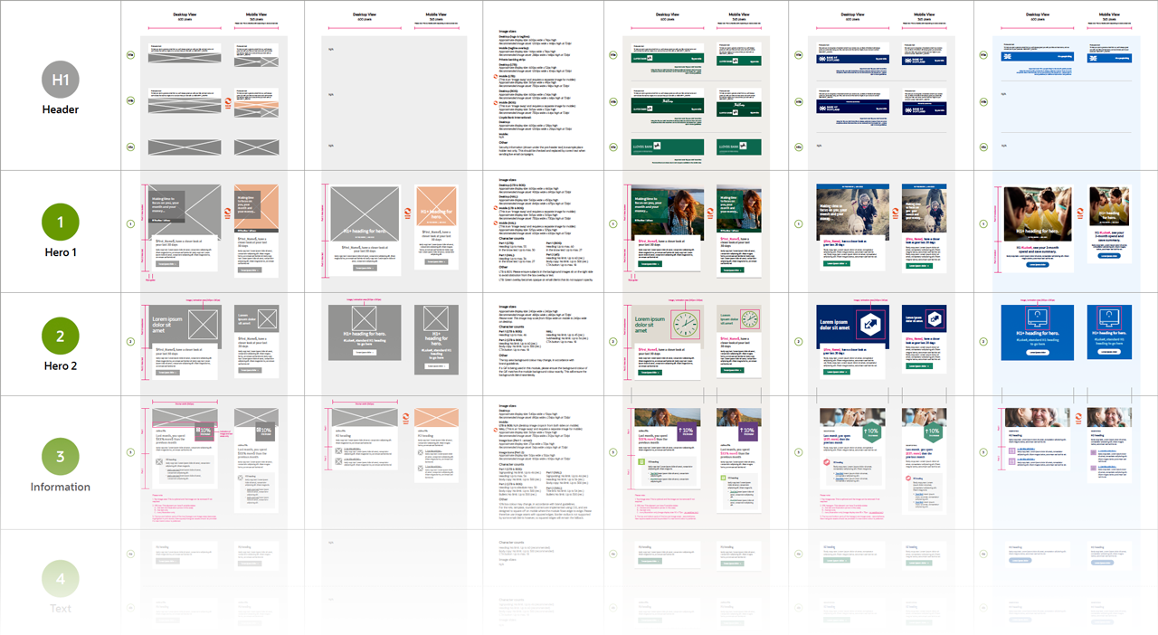 At Oracle, I worked on the design, development, and documentation of a fully responsive, accessible, and dark mode-optimised modular email template design system for Lloyds Banking Group. This involved creating a master HTML framework and a set of re-usable content modules which could be flexibly stacked and re-arranged in any configuration to build out custom emails efficiently and at scale for high volumes. To standardise the design process and drive cost-savings, modules were reskinned for multiple brands (using custom fonts, logos, colours, and imagery), and saved out as separate modular templates, each maintaining a strong visual identity that adheres to its individual brand style guidelines. Brands include: Lloyds Bank, Halifax, Bank of Scotland, MBNA, and more.