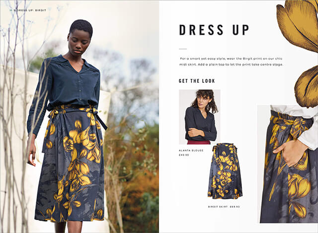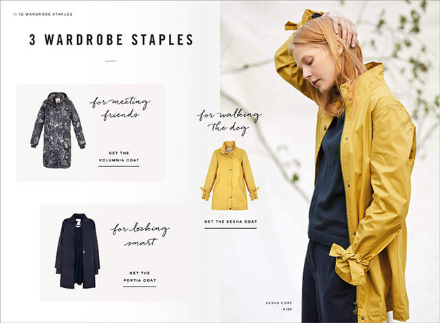 On desktop, the look book is presented in the format of a carousel, with controls to flick between slides and pause the slideshow. Thumbnails are displayed below the large preview, to enable easy / quick navigation between slides. Where product is featured, shoppable bag icons reside, which once hovered with the cursor, pop up a shoppable tooltips. These tooltips give the name of the product that is hovered, its price and a brief description. This feature allows customers to easily shop products without having to navigate away from the page; thus increasing conversion rates.