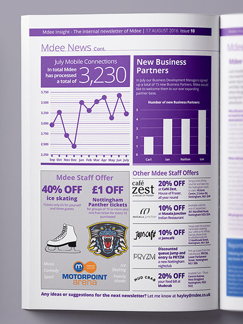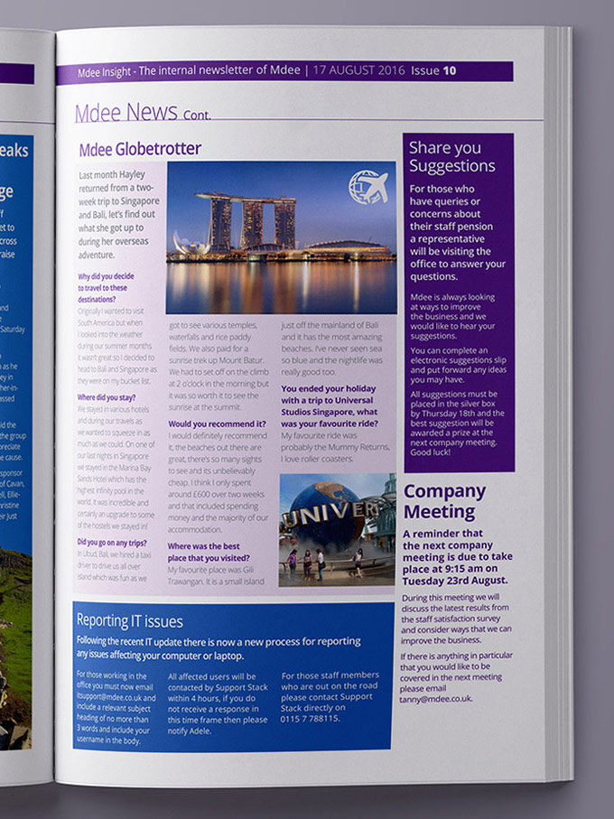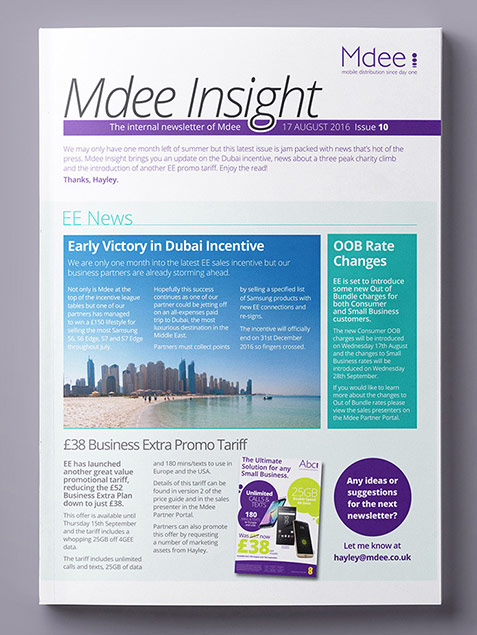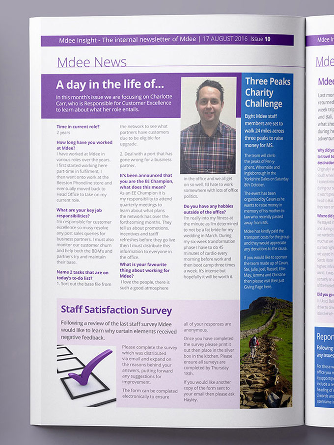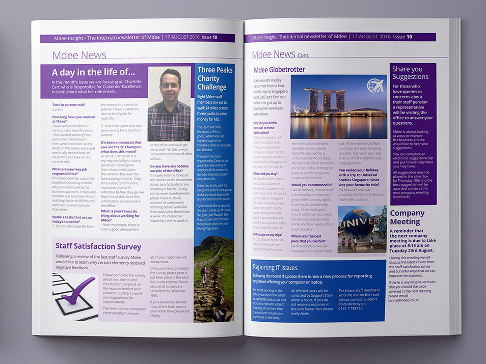 This project involved me designed and laying out Mdee's weekly employee newsletter using InDesign. The issue contained recent news about the company and its employees, with interviews and columns featured. Style guidelines were maintained for consistency with previous issues, including headings, body copy and colours. Gutters, bleed and CMYK colour profiles were considered for print.