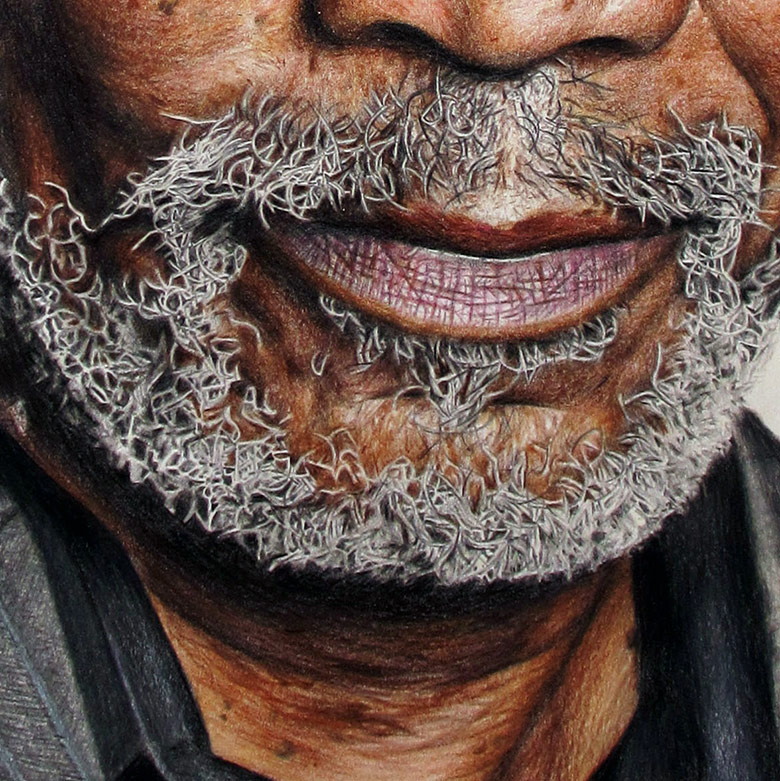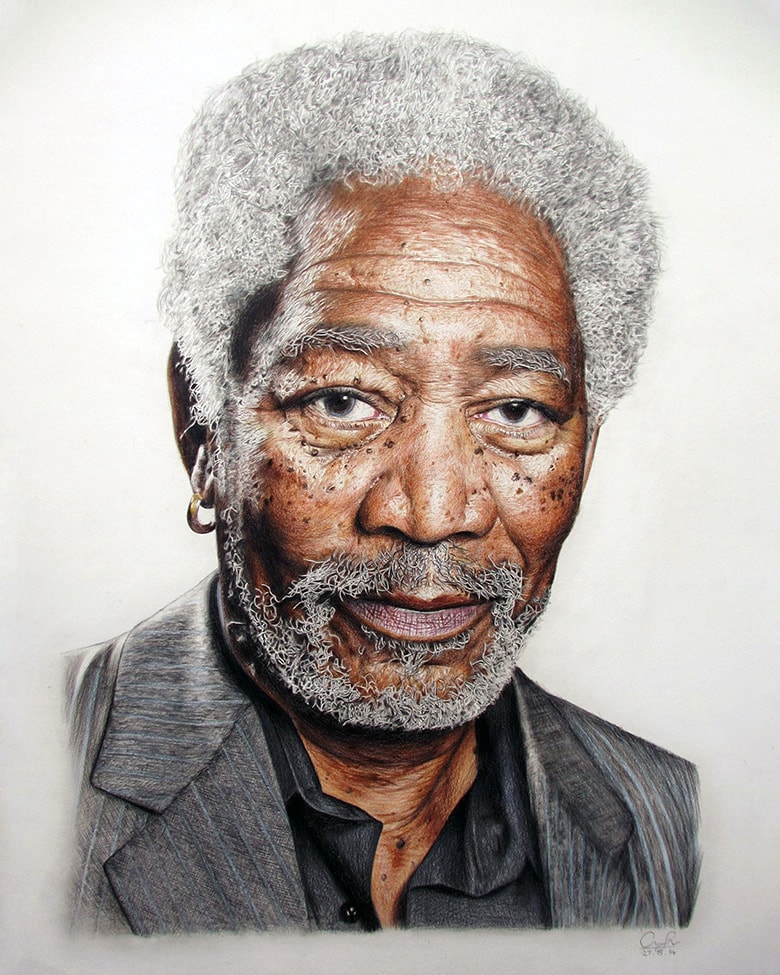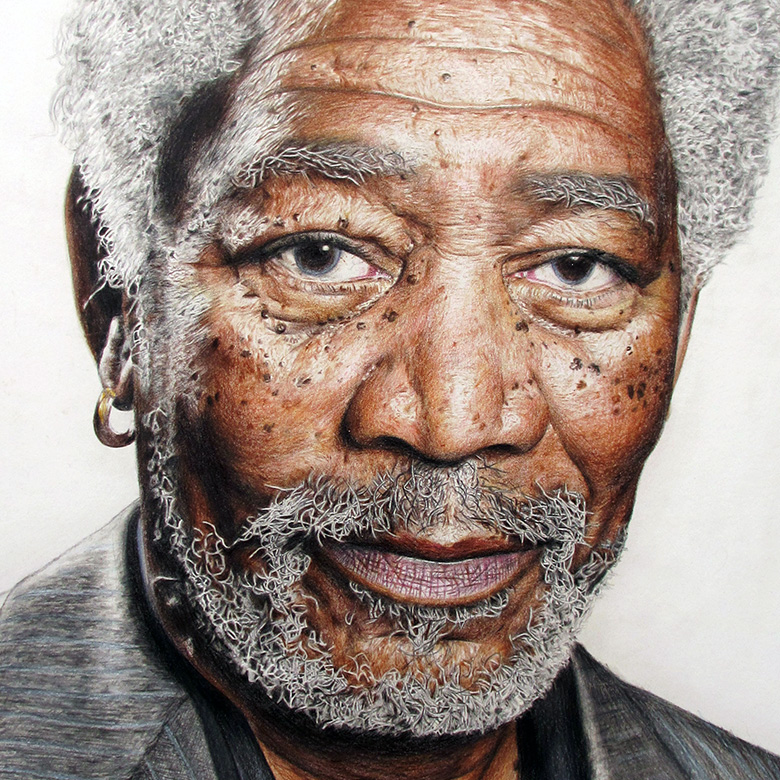 This is a coloured pencil portrait that I drew of Morgan Freeman on A1 paper. This hyper realistic drawing was undertaken to challenge my illustration skills and to practise my eye for detail, shadow and skin tone. I chose Morgan Freeman as the subject as he has such a recognisable face, and has many lines, hairs and wrinkles on his face which create great visual interest. His hair was exceptionally tricky to draw due to it being white, so I had to carefully draw around each hair to leave white negative space. In total, the piece took me around 50 hours to complete.