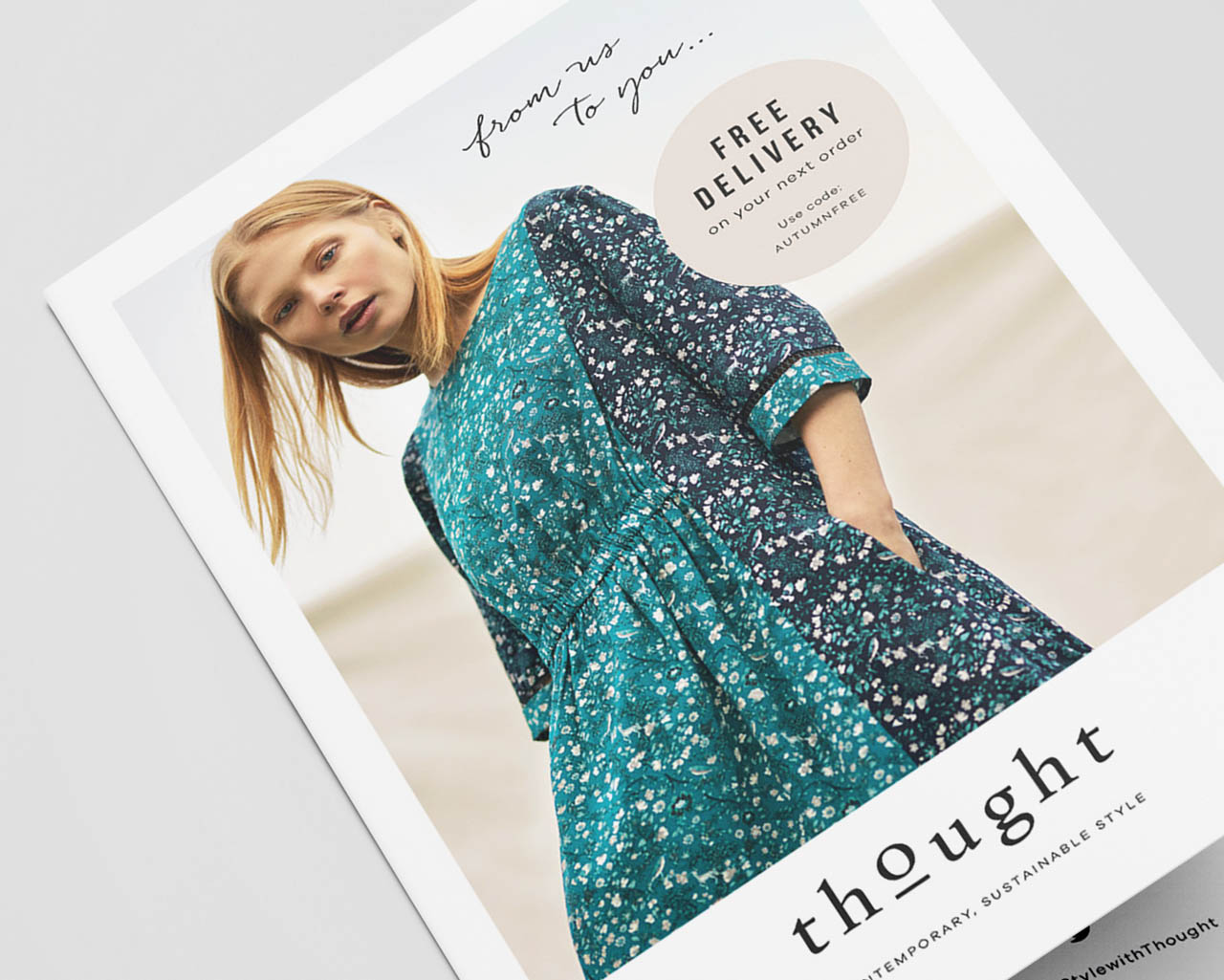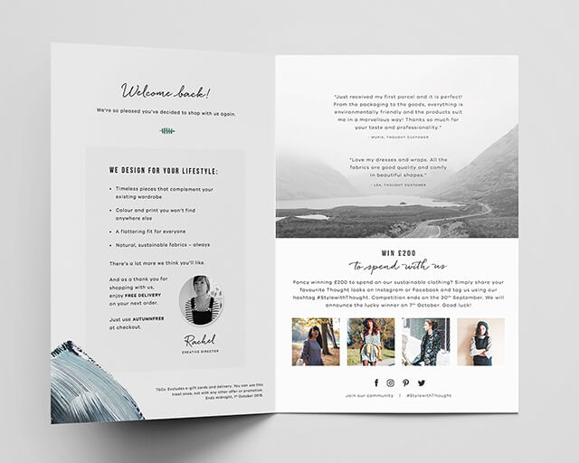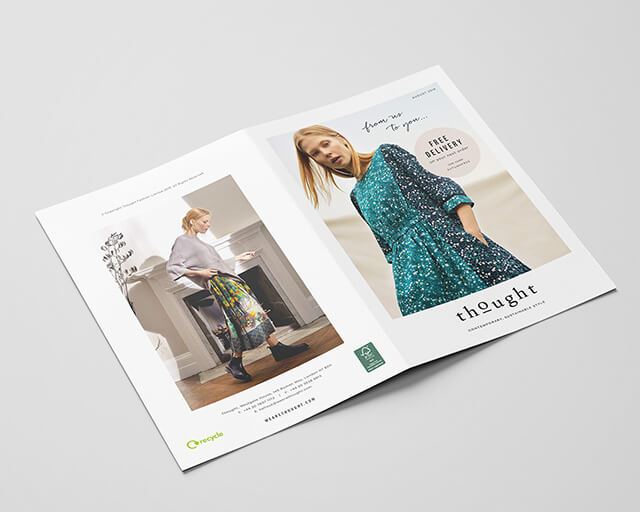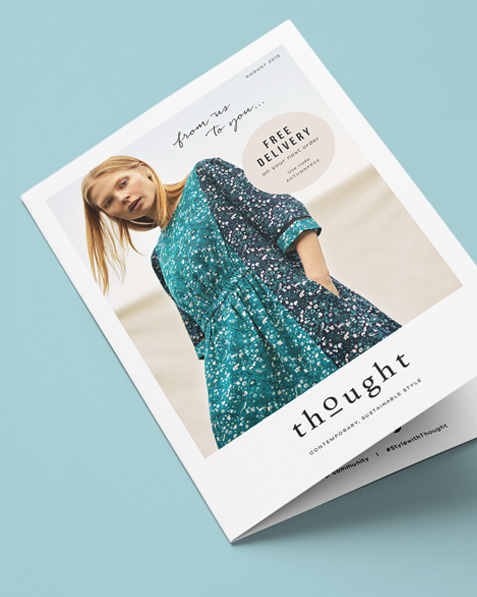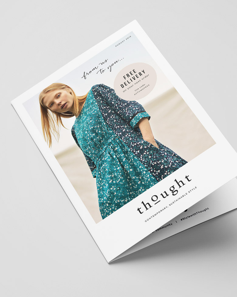 A monthly parcel insert bi-fold flyer for Thought Fashion Ltd, posted with every customer order. The purpose of this flyer is to attact, inform, inspire and retain new and existing customers. This is achieved by informing the customer about the brand, inspiring them with attractive product imagery, inviting them to join the online community, and offering free delivery / 10% off discount incentives.
