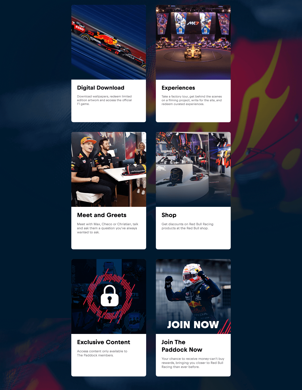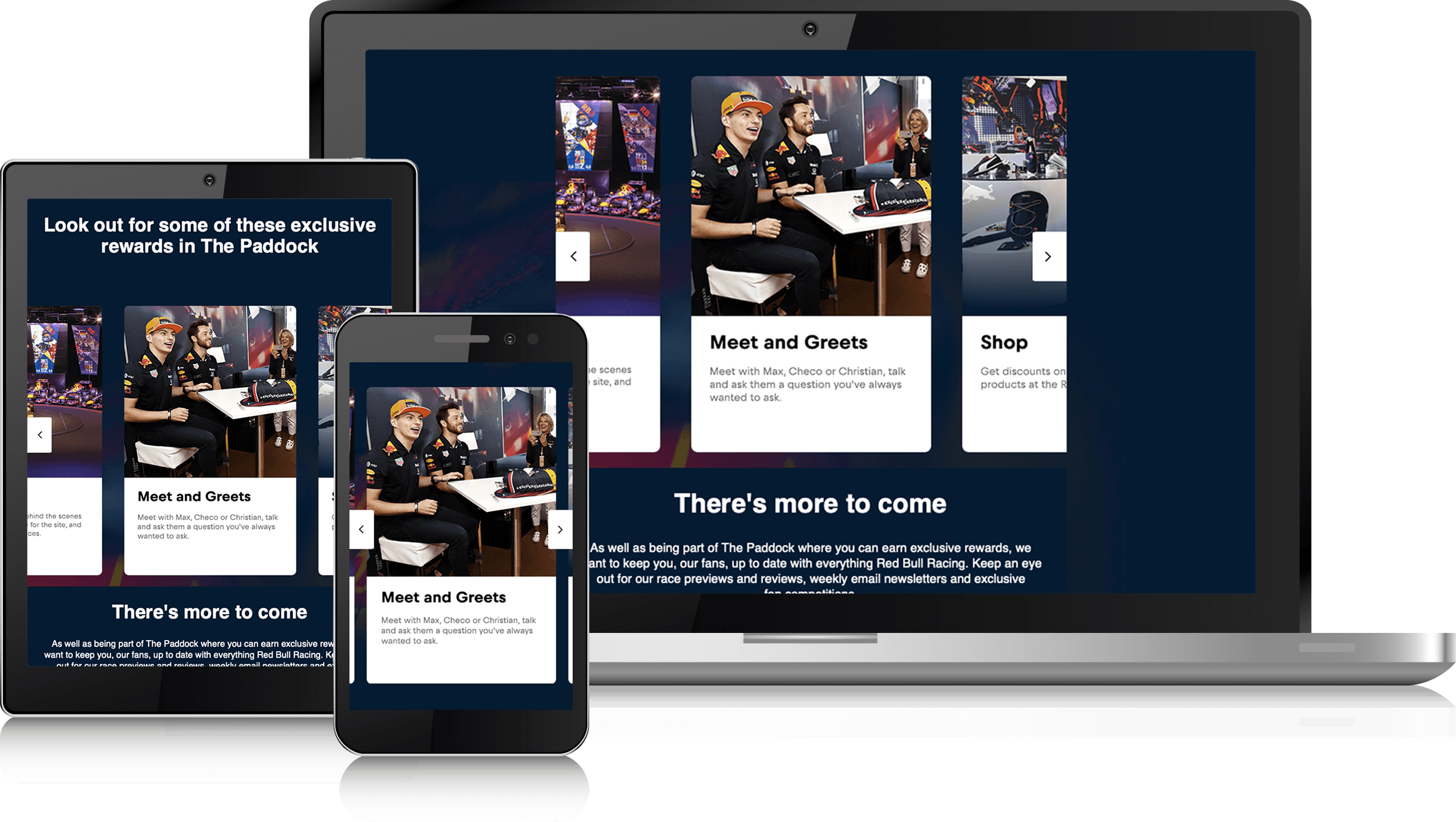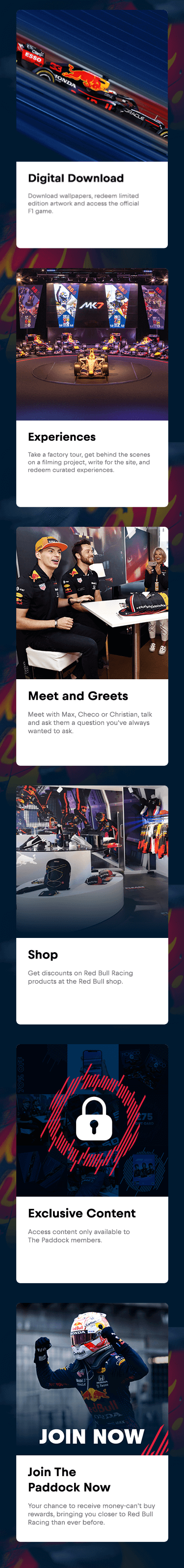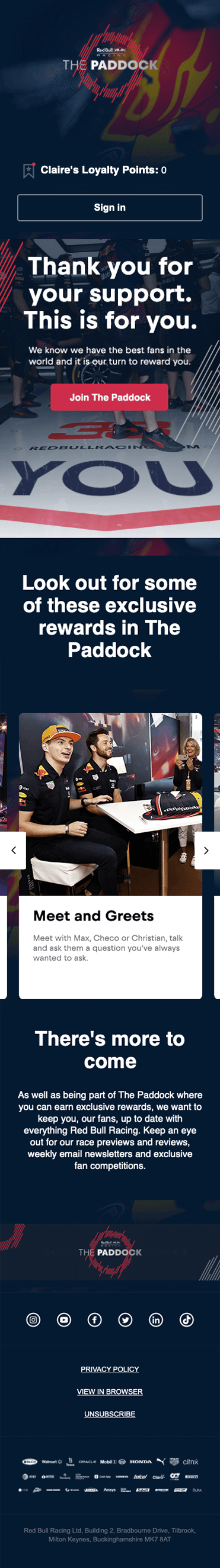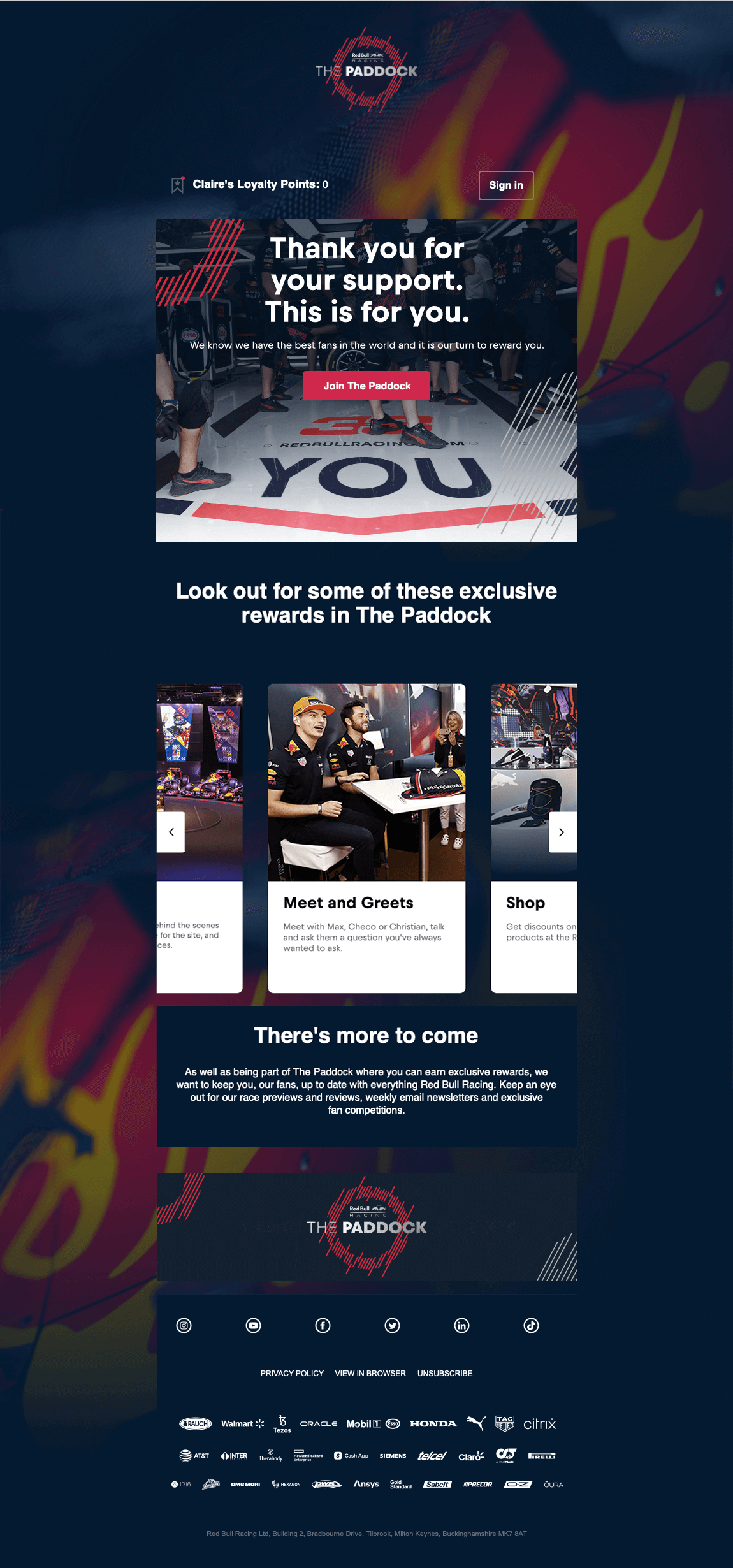 For Oracle Red Bull Racing's new loyalty programme (The Paddock) launch email, I was responsible for creating a fully responsive carousel module that enabled customers to navigate through benefits by using interactive arrow buttons.